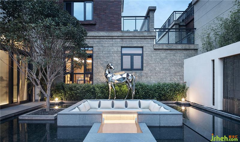 一層客廳與庭院相連,視野開闊。庭院內(nèi)設(shè)有下沉式水景休息區(qū)以及水幕簾景觀墻,庭院水池間設(shè)有下沉休息區(qū),讓人們在休息時更加親近大自然,給人不一樣的視角和體驗?!霸倩厥住苯饘偎囆g(shù)馬是樣板房設(shè)計師專門為庭院空間打造的藝術(shù)雕塑,多棱鏡面的反射讓物象自然相映,青山綠水,雍容自在。