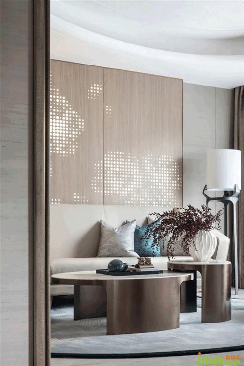 作為家庭溝通情感交流的區(qū)域二層家庭廳,沙發(fā)后墻面背景采用自然花形的沖孔透光木紋鋁板、與飾品器物靈動成趣、高低的茶幾組合讓空間更具有層次感。