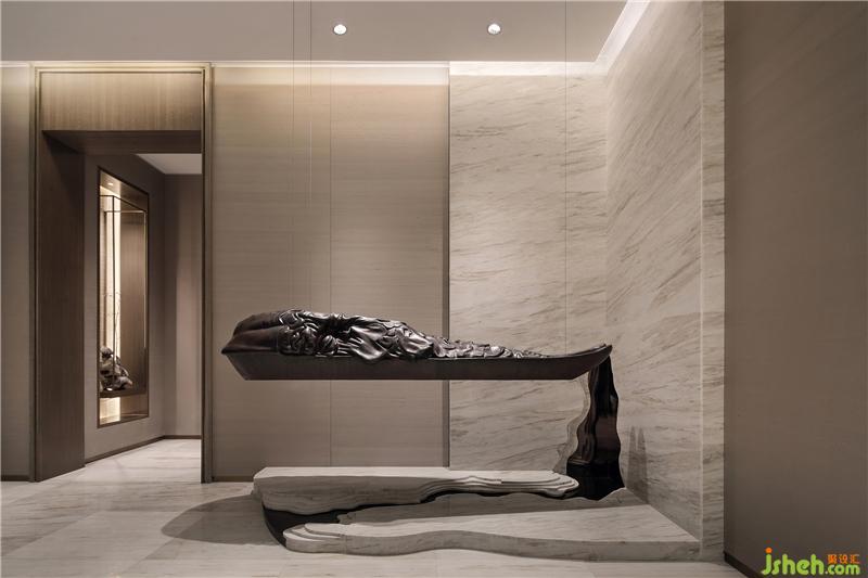 負(fù)二層過道的設(shè)計以“魚翔淺底”為主題,通過藝術(shù)家張華的作品——《云中歌》,結(jié)合大理石墻面及地臺的流水造型,搭配暖色的燈光,自在又安穩(wěn)。表達(dá)出自在悠揚的永恒畫面。人與空間對話,人與物的對話在瞬間定格在剎那。