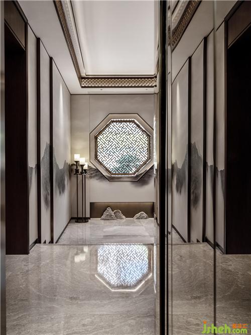 門廳的設(shè)計上,一方八邊鏤空花窗,幾處嶙峋山石,延引嶺南山水入內(nèi);水墨色體塊墻面層次堆疊,頂部融入東方吉祥紋樣,自然生發(fā)空間禮序與入宅儀式感。
