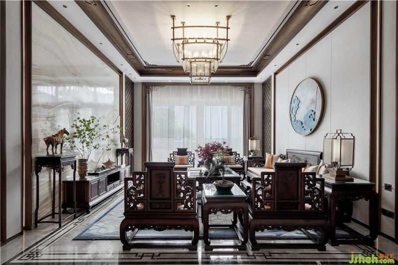 對于客廳的設(shè)計,莊重之下透露出克制的張揚,宮燈造型的水晶藝術(shù)吊燈、臺燈,承續(xù)轉(zhuǎn)合,搭配規(guī)整典雅、古韻悠然的紅木家具,古意與現(xiàn)代的結(jié)合,入室之后短暫的肅穆,將戶外的喧囂摒除,再則便是滿心的靜謐與安然。