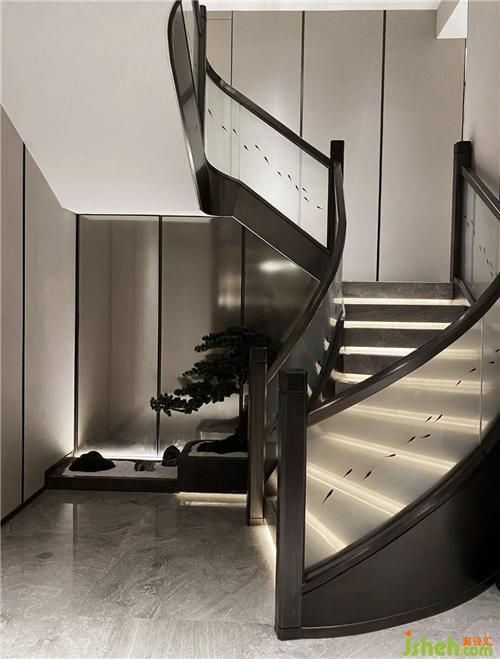 樓梯的打造是空間的重點,采用暖灰色大紋石材鋪設(shè),搭配金色的槽線,含蓄而張揚。夾絲玻璃擋板與古銅鋼框架扶手的組合,有若“淡淡流水載輕舟,悠悠魚兒水中游”。整個樓梯作為空間主軸,上下聯(lián)合,層層疊疊的序列感,衍生空間的意趣。