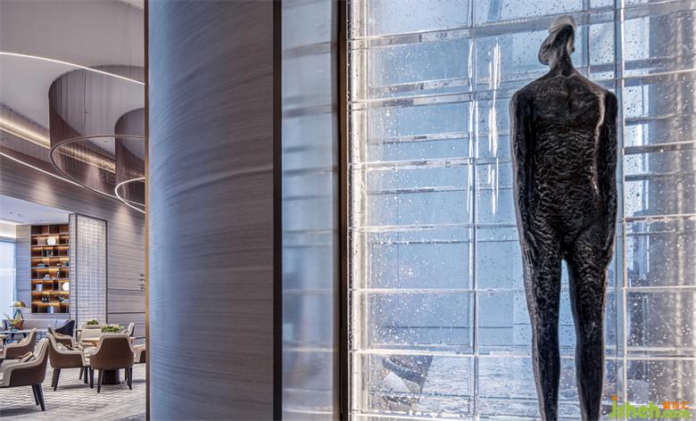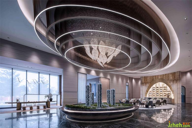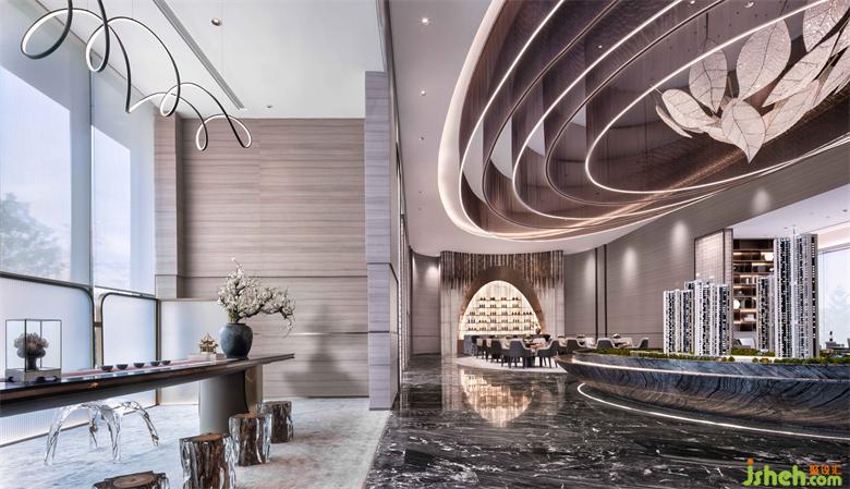 流動是水的永恒,深圳營銷中心設(shè)計提取流水漣漪意象予以藝術(shù)化重構(gòu),將金屬簾以陣列感層層散開,其蜿蜒的形姿于節(jié)奏感中散溢出清透高雅的美感,亦如大地之眼,使空間變得富于張力,也成為空間的靈魂及視覺焦點。