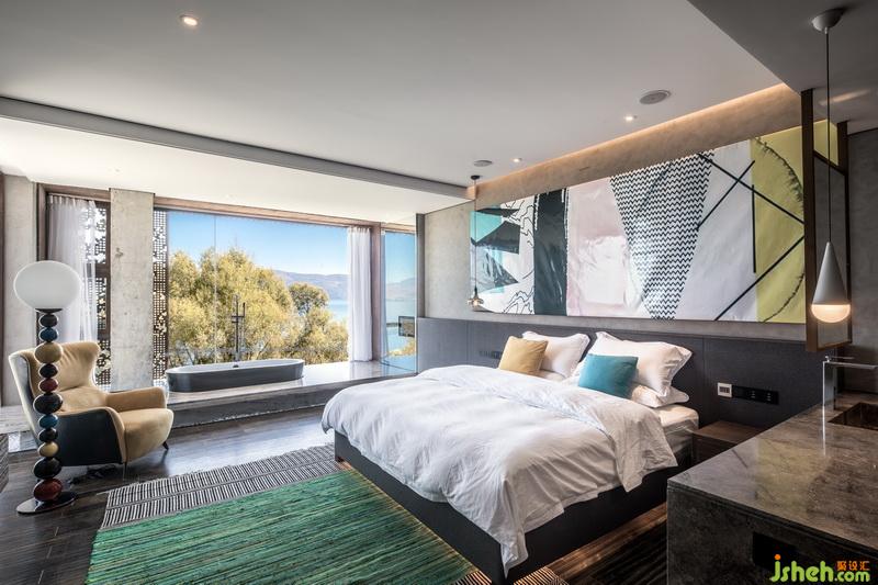 客房的設(shè)計也遵循這個原則。整面的落地玻璃窗,裸露的水泥墻面,白色的天花,把窗外的風(fēng)景放大。窗邊做了觀景臺,浴缸鑲嵌在地面中。泡澡看星空時,沉浸在山海的懷里。
