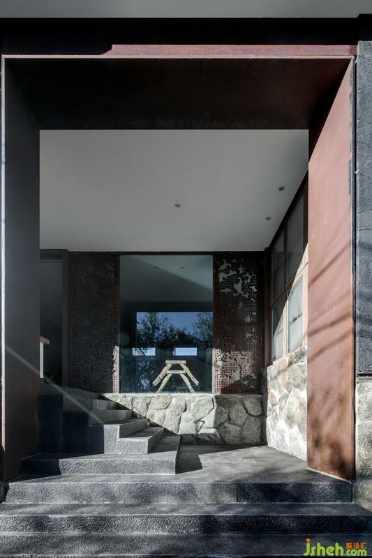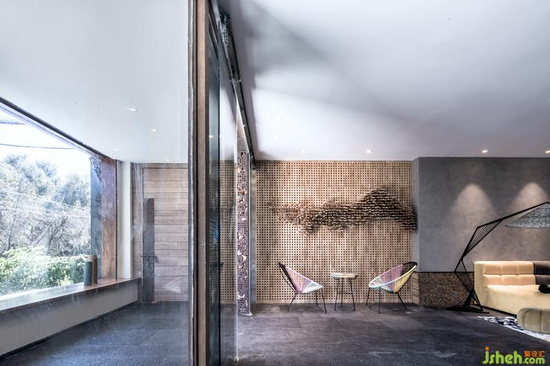 尹盛濤父親是木匠,他曾當(dāng)過幾年的木工學(xué)徒,對木頭有著深厚的感情??蜅S昧舜罅康哪靖駯叛b飾墻面,可變換不同的造型。溫潤的木頭和裸水泥墻面、青石板地面碰撞,彰顯材質(zhì)本身的美感。