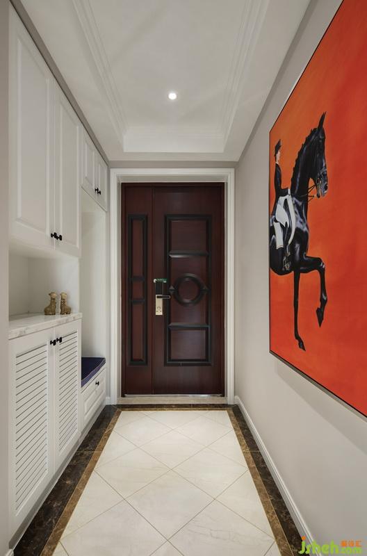 室內(nèi)設(shè)計師設(shè)計進門鞋柜中嵌入換鞋凳,美觀實用;走廊稍長,移步換景,選用了亮色掛畫讓人眼前一亮。