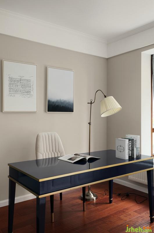 書房整體色調(diào)干凈,深寶藍(lán)烤漆 鑲嵌金邊的書桌透著小資。