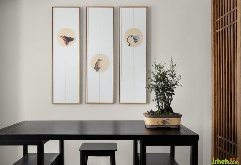 近看3副掛畫(huà)統(tǒng)一一體,美如潑墨山水間。