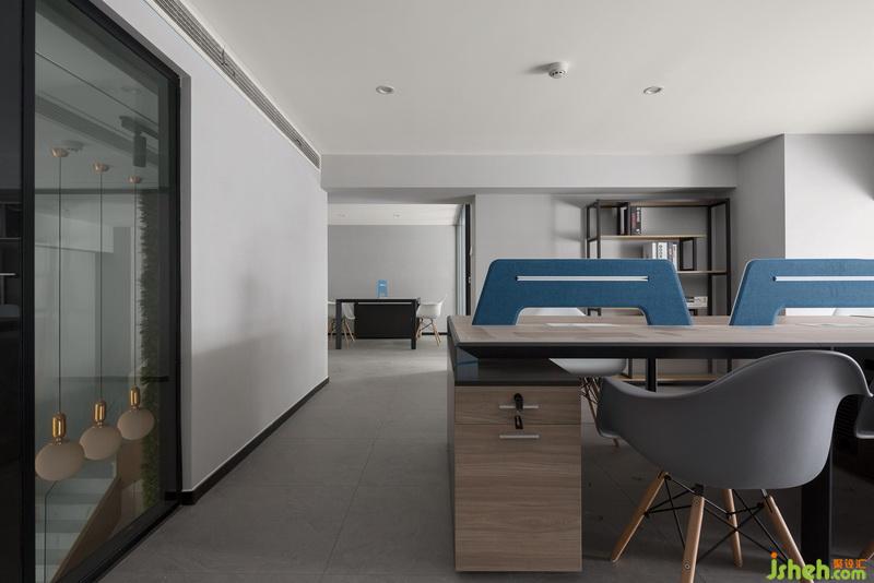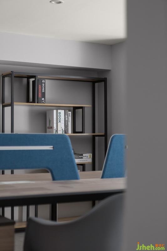 二樓辦公區(qū) 統(tǒng)一的現(xiàn)代設計風格,色調大氣,線條簡潔,局部的藍給人穩(wěn)重舒適感。線條簡約的書架,讓空間落落大方。