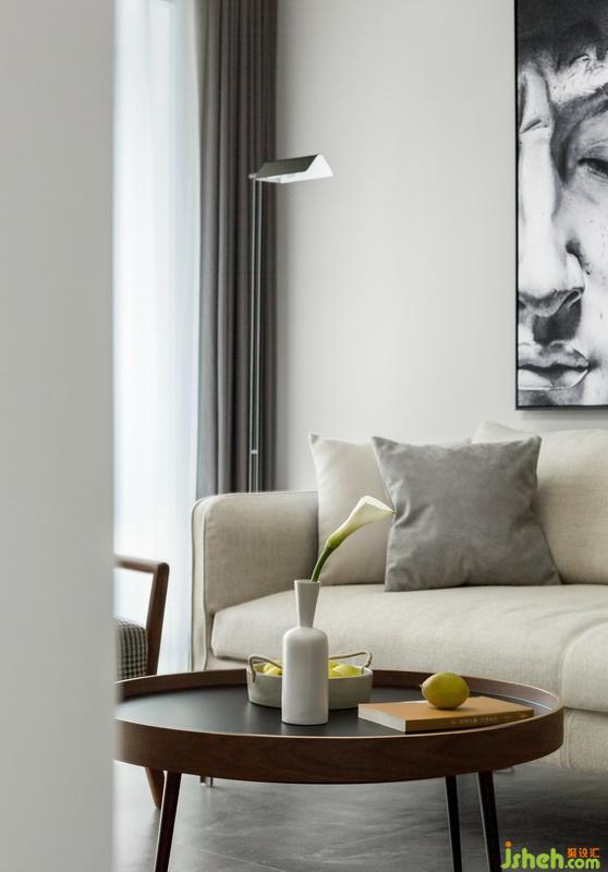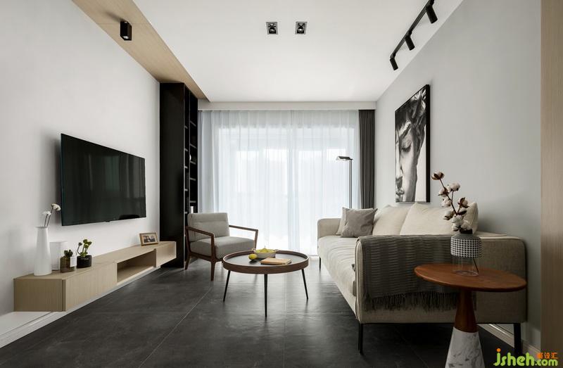 客廳吊頂拉平,無主燈。光源用落地?zé)?、射燈、筒燈結(jié)合,局部分散照明可以讓空間更有層次感。地面深色調(diào),整個(gè)墻面空間都是大面積留白,局部搭配木飾面,想要表達(dá)的效果是、穩(wěn)、空、質(zhì)。布藝米白色沙發(fā)、灰色窗簾,線條落地?zé)?、個(gè)性掛畫、與空間里的木色元素搭配,讓硬朗與柔和的交融。