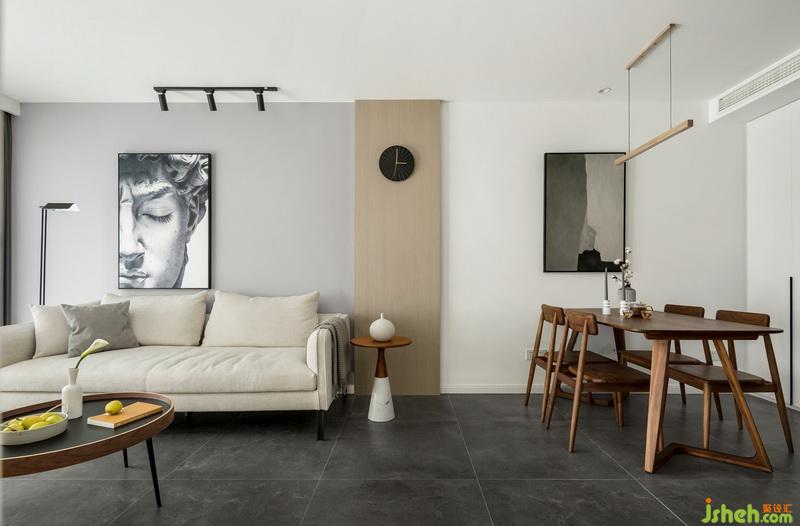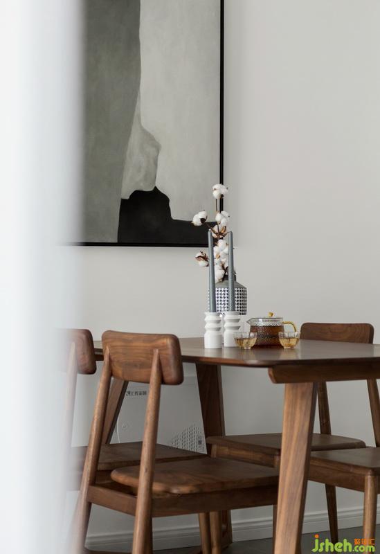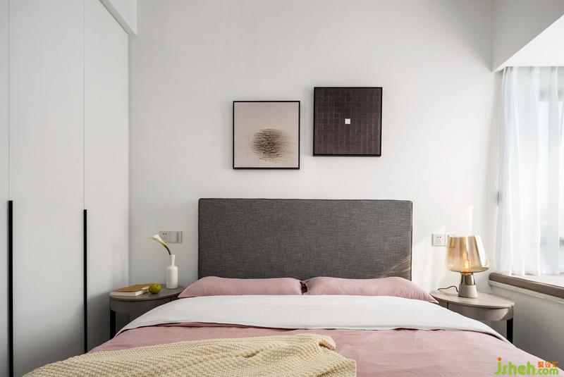 次臥硬裝整個(gè)空間以白和灰為主,怎樣讓整個(gè)空間更活潑一點(diǎn)呢?一副個(gè)性相錯(cuò)的畫,一套粉白四件套就是點(diǎn)睛之處。在掛畫的時(shí)候,我們臨時(shí)根據(jù)現(xiàn)場(chǎng)調(diào)整掛畫方式,按照常規(guī)兩幅畫在一個(gè)水平線上,但是覺得過于刻板,調(diào)節(jié)后的畫面感覺更生動(dòng)。
