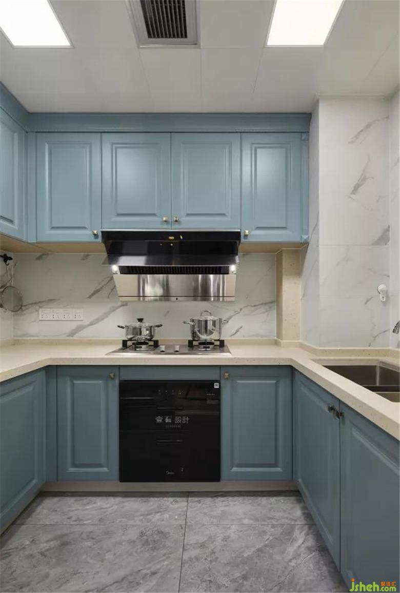 廚房裝修公司選用了純凈質(zhì)感爵士白石材配上藍(lán)灰櫥柜,大氣又高雅。