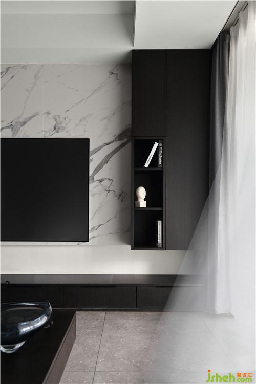 客廳電視背景墻采用白色紋理大理石,沙發(fā)背景采用深咖色飾面板,空間感,高級(jí)質(zhì)感來(lái)自于顏色和材質(zhì)的結(jié)合運(yùn)用。