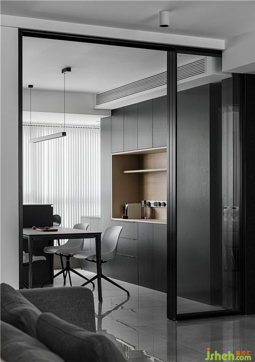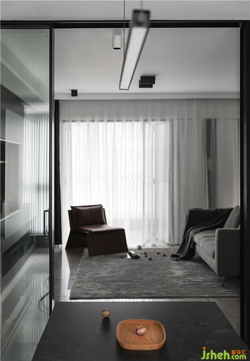 玻璃門劃分廚餐廳和客廳的空間,透露質(zhì)感,也解決了油煙的困擾。