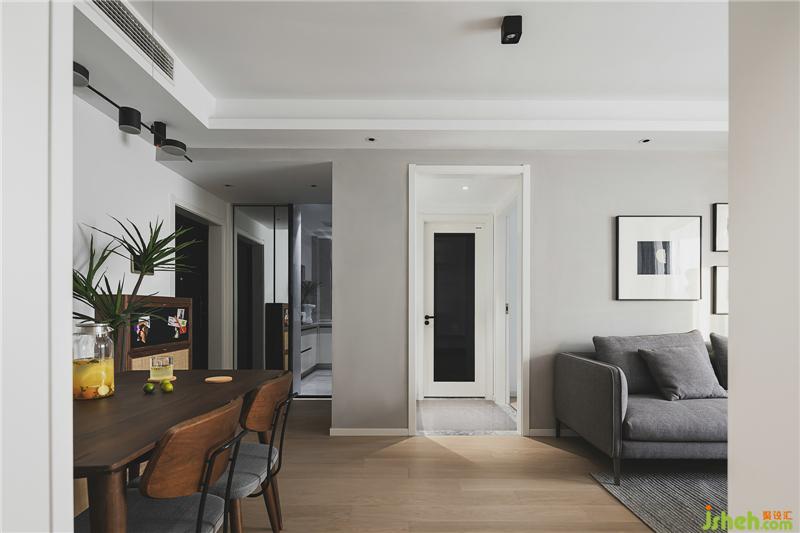餐廳沿墻而設(shè)卡座,既可作為餐椅,也可用于收納,餐桌餐椅的選擇和進(jìn)門(mén)鞋柜,色調(diào)風(fēng)格相呼應(yīng)。