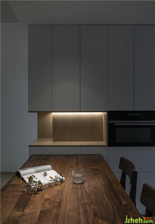 邊柜留空,暗藏?zé)魩?,營造餐廳氛圍。