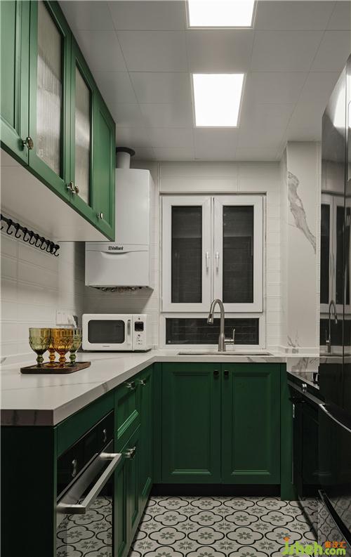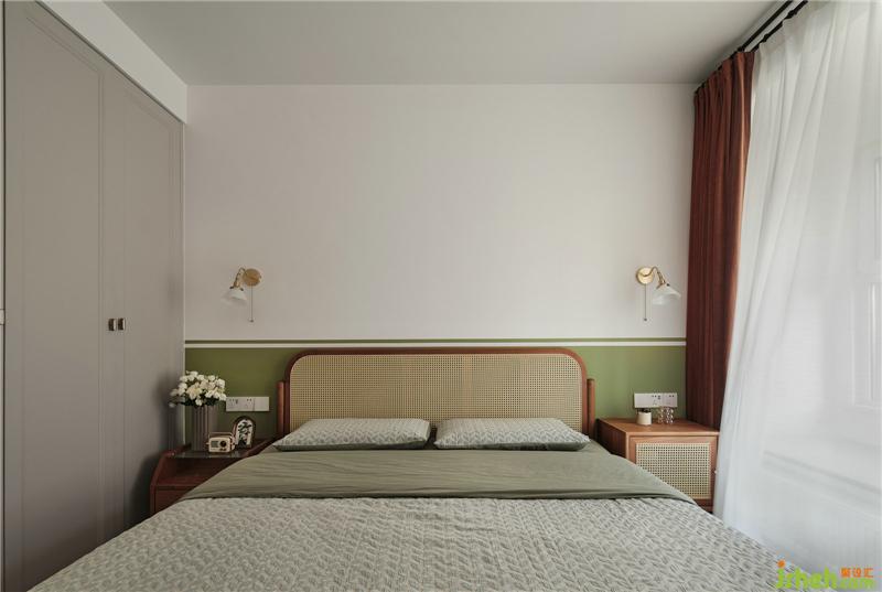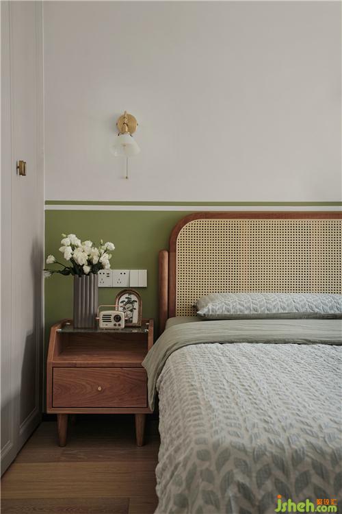 主臥,延續(xù)綠色主題,綠白拼色墻清新自然,給父母一個明亮和煦的休息空間。