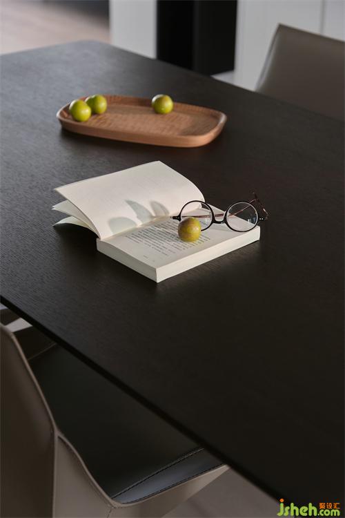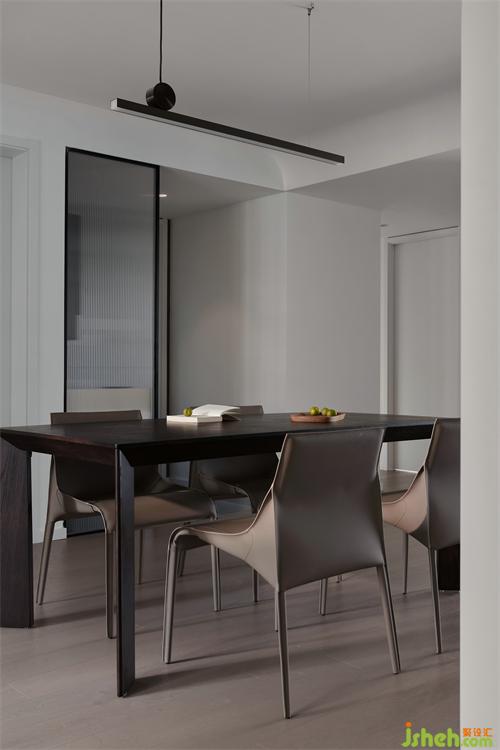 空間秩序感,也體現(xiàn)在對(duì)細(xì)節(jié)處理,餐廳選擇一組皮質(zhì)餐椅,光潔細(xì)膩有品味,也容易打理。