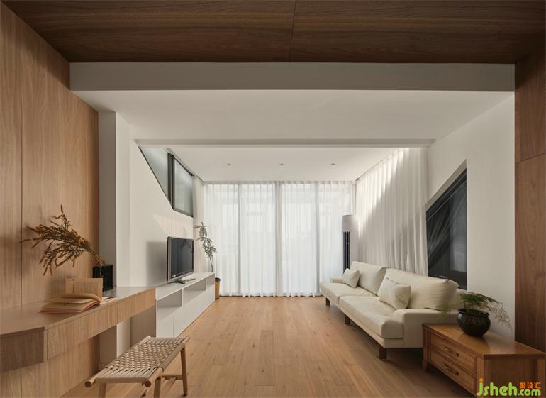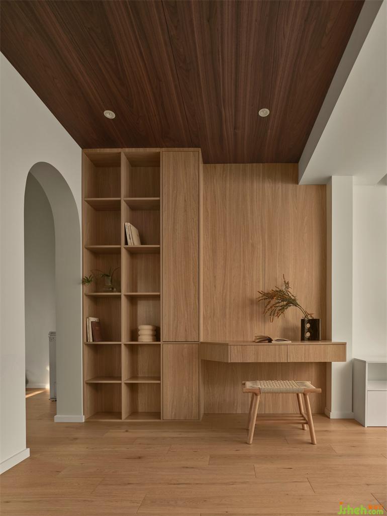 二樓原有露臺(tái)改為客廳,頂部木飾面和墻面木飾面形成方形造景框,復(fù)式裝修設(shè)計(jì)劃分出單獨(dú)的書桌辦公空間,客廳保留了露臺(tái)的部分原始架構(gòu),頂部吊頂隔熱,空間相對(duì)無序,沒有邊界,自由而舒適。