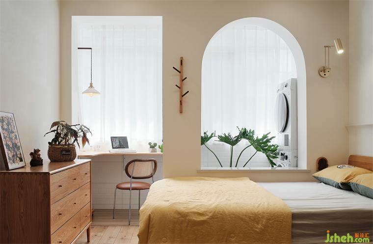 陽臺并入臥室,取消原來的窗戶,用弧形窗洞做成隔而不斷的效果,也增多臥室內(nèi)部的光線。