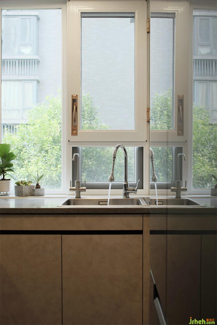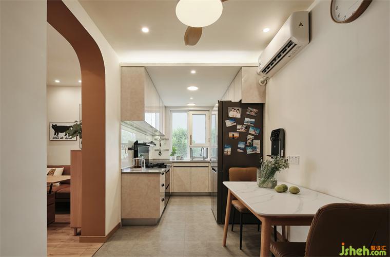 開(kāi)放式廚餐廳,讓空間顯開(kāi)闊,同時(shí)也便于家人互動(dòng),媽媽在廚房準(zhǔn)備食物的時(shí)候,也能看到在公共區(qū)活動(dòng)的孩子。