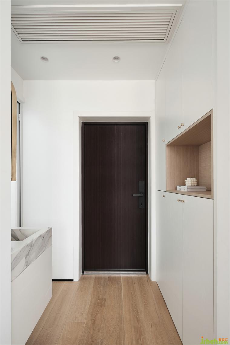 入戶(hù)玄關(guān),頂天立地一整面鞋柜,可以擺放一家人的鞋子,中間預(yù)留開(kāi)放區(qū),裝修公司可以隨手放鑰匙包包等小物件。