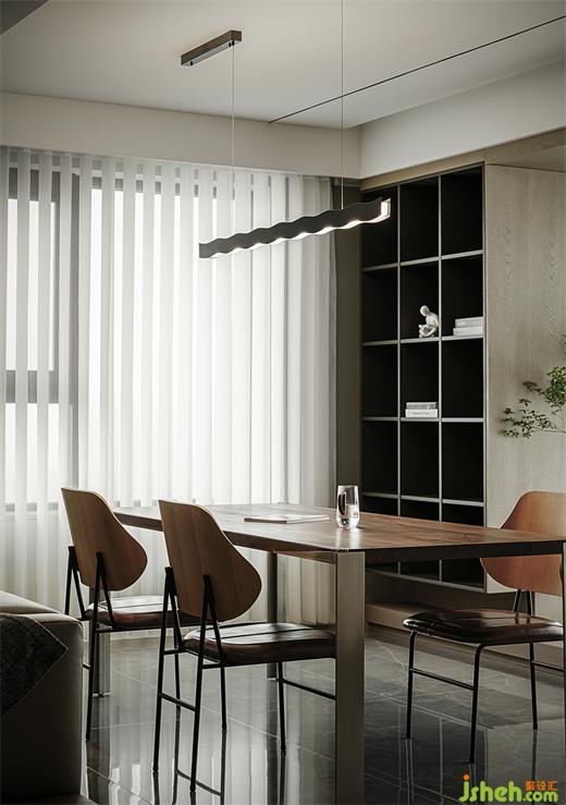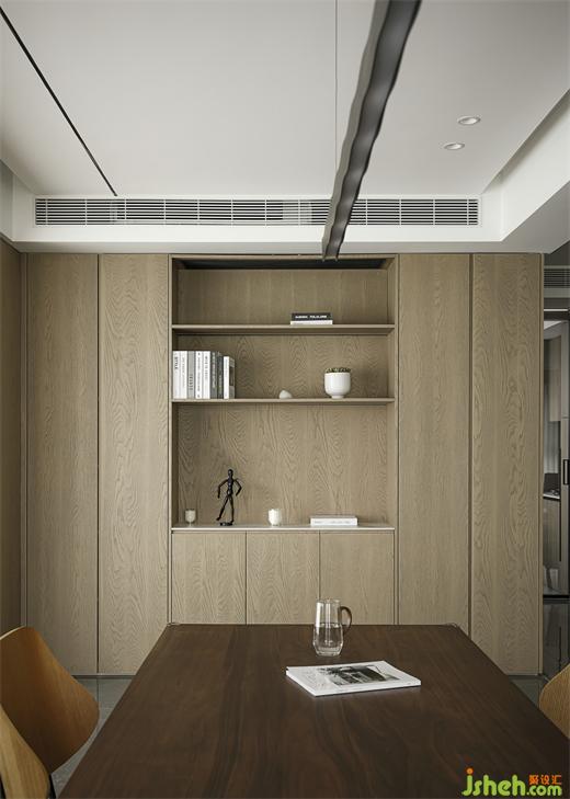 敞開(kāi)式工作學(xué)習(xí)區(qū),利用拐角墻體做了懸空書架,空間更豐富。南京大平層裝修設(shè)計(jì)選用大尺寸方桌,一盞吊燈,讓開(kāi)放式也有了聚攏的氛圍感。女主職業(yè)為老師經(jīng)常帶孩子在此看書學(xué)習(xí)。