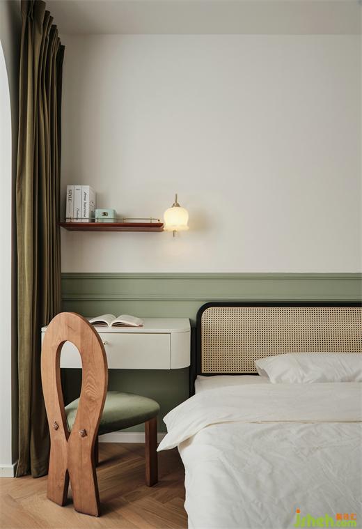 臥室,告別傳統(tǒng)床頭柜,根據(jù)設(shè)計(jì)定制了這樣一款懸浮柜,裝修公司可做女主化妝臺(tái),柜角處還貼心做了弧角,防止磕碰。
