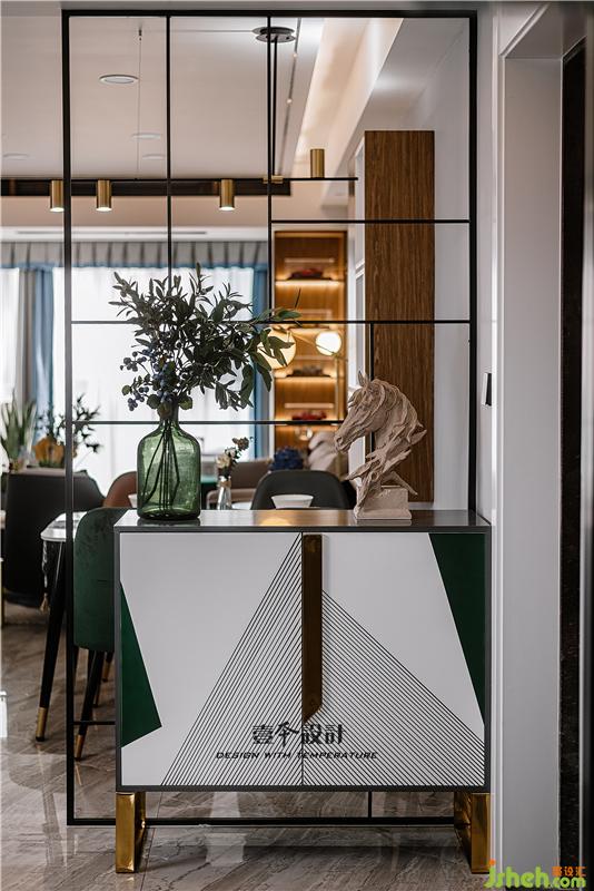 ▲玄關(guān)處一面黑色不銹鋼隔斷很好的分割了入戶玄關(guān)與客餐廳兩個(gè)區(qū)域。一款拼色的玄關(guān)柜撐起了整個(gè)空間的格調(diào),時(shí)尚簡(jiǎn)約的造型,黑色烤漆的臺(tái)面,金色的柜腿設(shè)計(jì),將形式上的意與美結(jié)合,時(shí)尚又不缺乏質(zhì)感。柜子上隨意擺放的馬頭,打破了空間的沉悶感,在燈光的映襯下呈現(xiàn)出完美的視覺(jué)效果。室內(nèi)設(shè)計(jì)師