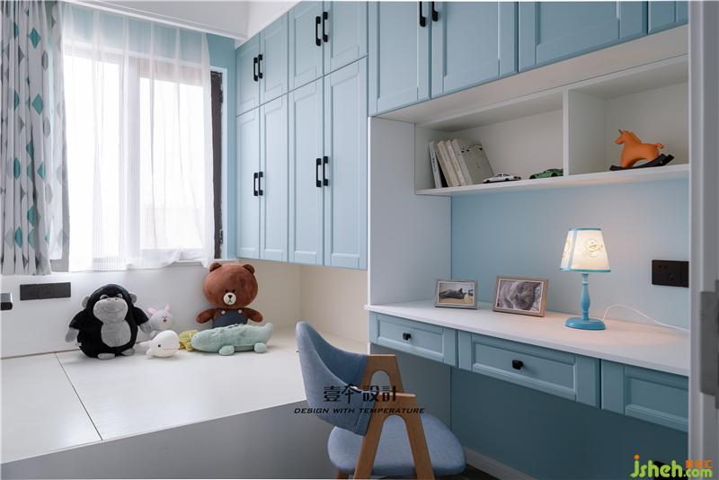 ▲寧靜氣質的藍色作為背景色,放置在榻榻米上的毛絨玩具是吸引孩子的關鍵??ㄍ艟?、可愛的貓咪擺臺映襯著孩子們單純可愛的內心天地,再加上拼花色的窗簾更能激發(fā)孩子對外面世界探索的樂趣。