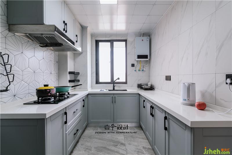 ▲白色的墻面搭配灰色的地面,黑色的置物架點綴空間,俏皮的黃色和綠色跳出了整個的寧靜感,創(chuàng)造了一個冷酷美感的廚房空間。
