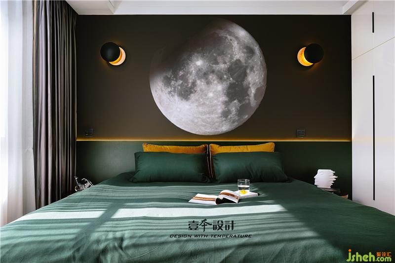 沒錯,黑色墻紙正是大家熟知的月球圖案,周導(dǎo)本身既是影視從業(yè)者也是電影發(fā)燒友,設(shè)計階段恰逢電影《流浪地球》的上映,我們一拍即合,當即決定采用太空題材的元素來打造主臥風格。床頭背景墻選用了這一款月球壁紙圖案,壁紙的下面是綠色的皮質(zhì)護墻板,護墻板內(nèi)暗藏燈帶的光線猶如從飛船舷窗內(nèi)望向深邃的太空。墻上的壁燈就好像宇宙中漂浮的星球,加上中間的飛碟主燈,一起散發(fā)出柔和的光線,造型溫情而浪漫。室內(nèi)設(shè)計師
