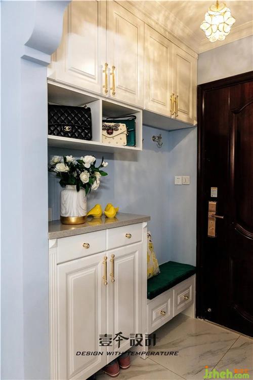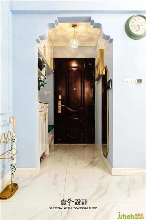 打開(kāi)門(mén),玄關(guān)處花瓣一樣的拱形門(mén)洞在歡迎主人回家。墻面以藍(lán)色為基調(diào),搭配白色的柜子,寧?kù)o的藍(lán)色與素雅的白色,清新自然。金屬拉手裝飾其中,搭配花朵形狀的小吊燈,精致的生活處處彰顯。
