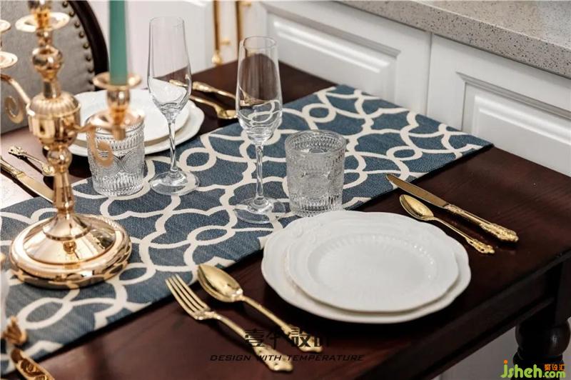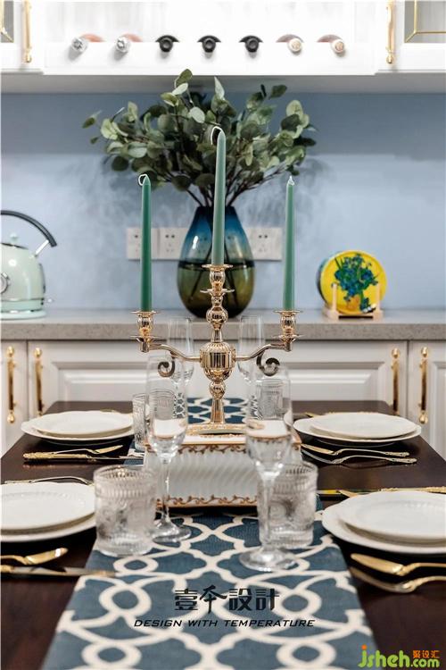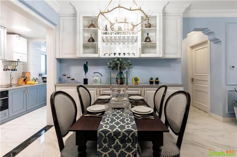 藍(lán)色浪漫一直延續(xù),沉穩(wěn)的木質(zhì)餐桌椅與華麗的水晶吊燈結(jié)合,精致又大方。餐桌旁邊的吊柜和儲(chǔ)物柜,滿(mǎn)足了收納和展示的需求。金色的餐具優(yōu)雅高端,散發(fā)著滿(mǎn)滿(mǎn)的輕奢氣息。