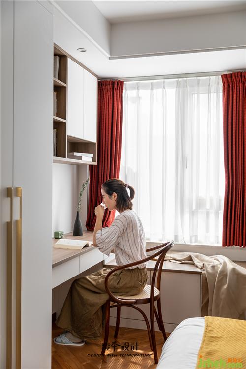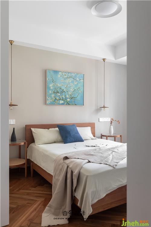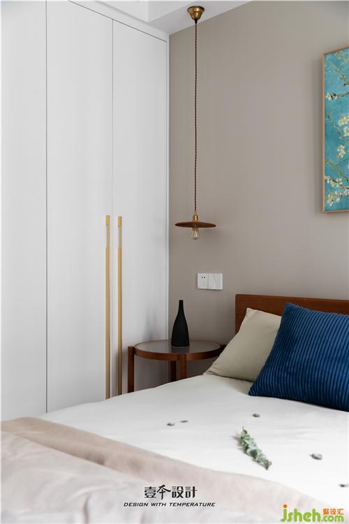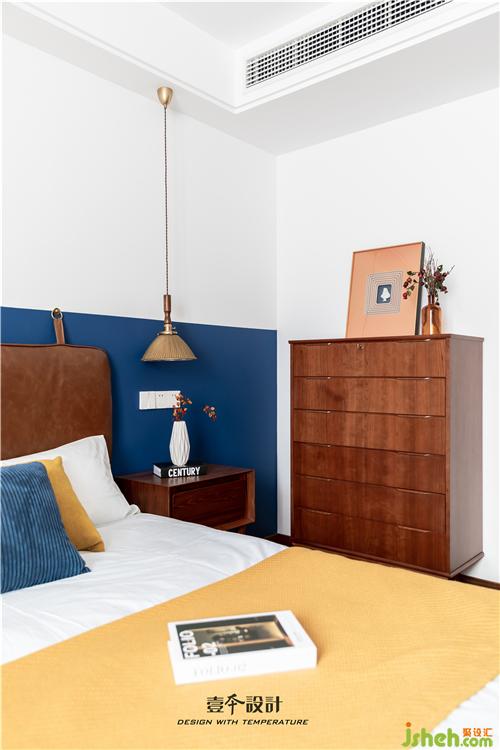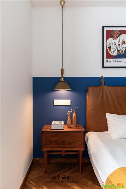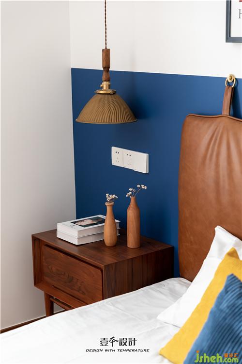 主臥藍(lán)色背景和黃色抱枕的結(jié)合,使空間看起來(lái)不枯燥,能夠感受到活潑新鮮感。牛皮靠背的真皮床,簡(jiǎn)約中融合了品質(zhì)、藝術(shù)與功能實(shí)用。衣柜旁還有一處休閑區(qū),休閑舒適的氛圍不失空間的功能性與沉穩(wěn)感,光影交錯(cuò),在飄窗上灑下一米陽(yáng)光。
