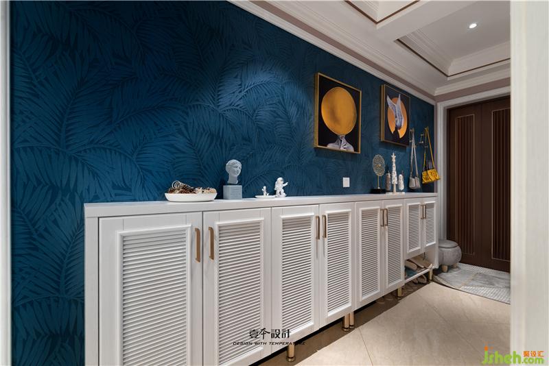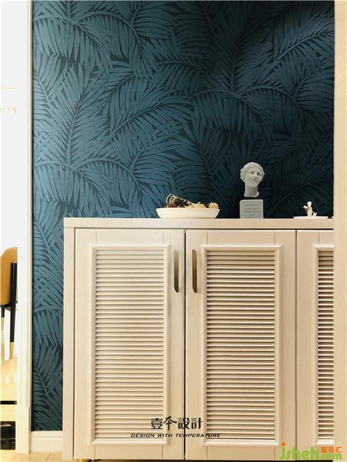 進(jìn)門右手墻面比較長,為降低視覺上的沖擊力,室內(nèi)設(shè)計(jì)師做了一組鞋柜,進(jìn)門將包包等物品掛在金屬掛鉤上,坐在換鞋凳把鞋換下,底部懸空便于收納常用拖鞋,百葉門鞋柜搭配金屬把手,簡潔大方。
