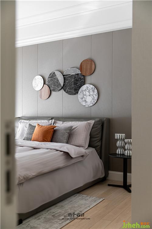 主臥床頭背景保留原造型不做改變,室內(nèi)設(shè)計(jì)師精心選擇一個(gè)點(diǎn)睛的裝飾物來(lái)達(dá)到增色的效果,并通過(guò)床品、家具、窗簾的顏色搭配來(lái)烘托溫暖舒適的睡眠空間。