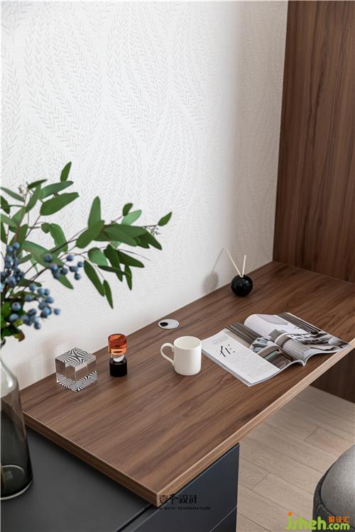 將衣柜與梳妝臺(tái)合二為一,二者通過(guò)大板連接起來(lái),自然而流暢的將女主梳妝臺(tái)與日常的隨手掛放,儲(chǔ)物區(qū)域融為整體。