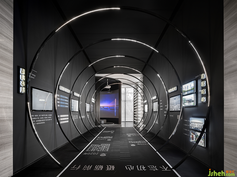 一條時間隧道,連接了兩個空間,科技感十足的LED燈帶,將方體空間重塑,一環(huán)一環(huán)加載了穿梭體驗。深色背景退后,將注意力投入在屏幕上輪播的影片上,解析產(chǎn)品的精髓。