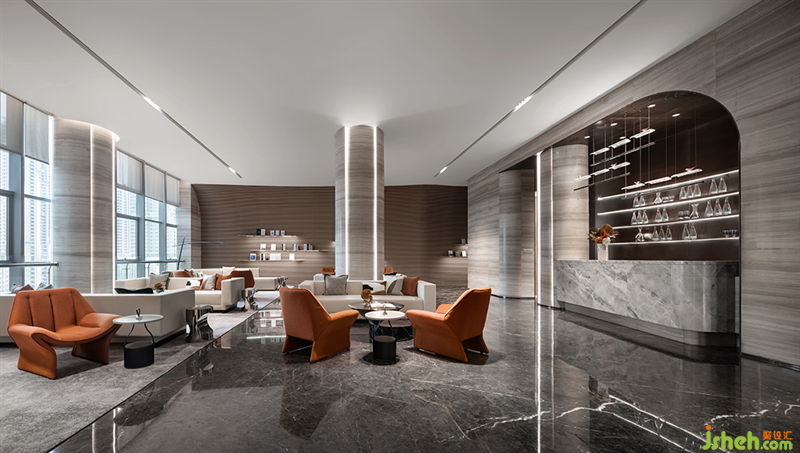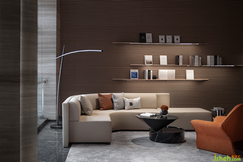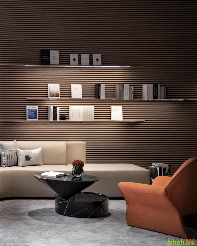 武漢售樓處設計從山形墻面的階梯式書吧,延續(xù)到洽談區(qū),嵌入隱形結(jié)構(gòu)的層板,在墻面上形成自然書架。暖意的皮革沙發(fā),形成舒適且人文氣息濃厚的洽談場景。橙色的軟裝點綴在空間中,形成一個個跳躍靚麗的音符。