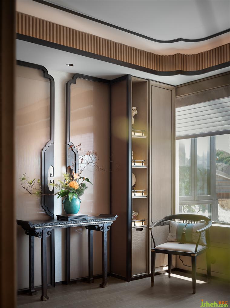 餐廳吊頂提取梅花元素,與墻頂連通形成整體,窗邊背景植入水墨畫(huà),古意雅致與中式朦朧感渾然而成。