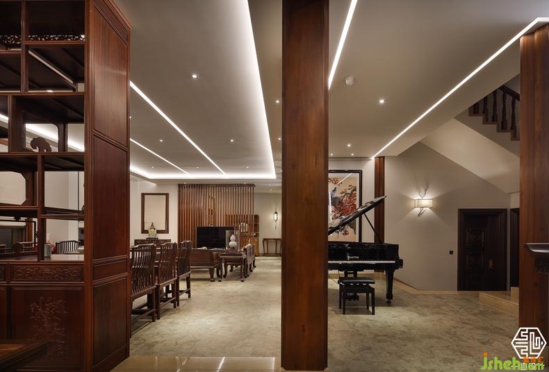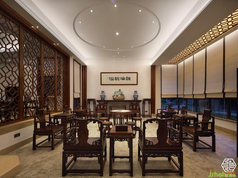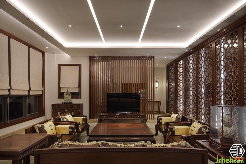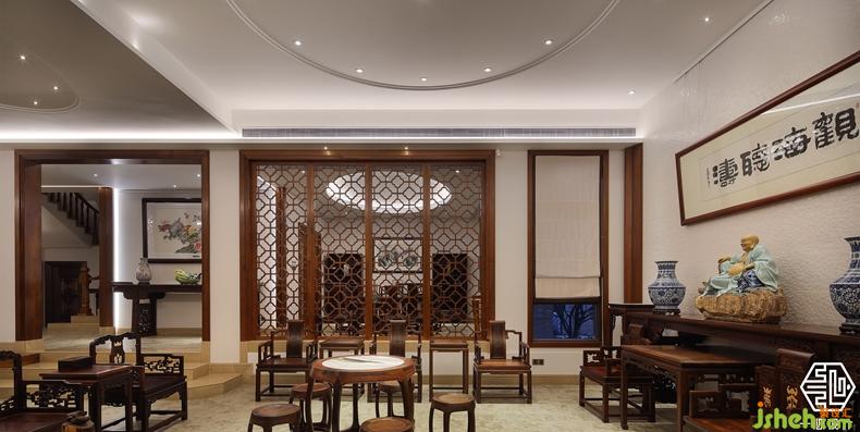 該案由兩個別墅圍合成一個院落形式,故稱合院別墅。設(shè)計師根據(jù)兩位業(yè)主不同愛好,用中式的手法演繹兩種不同風格的中式設(shè)計。其中嶺南人家酷愛柚木,酷愛紅木家私,別墅裝飾設(shè)計師巧妙的合其所好,熾烈的嶺南文化與奔騰的紅木藝術(shù)風格相互融合,形成了具有南方特色的中式別墅風格。