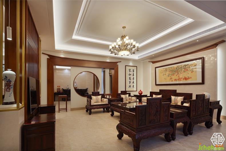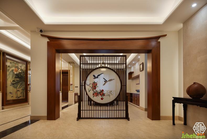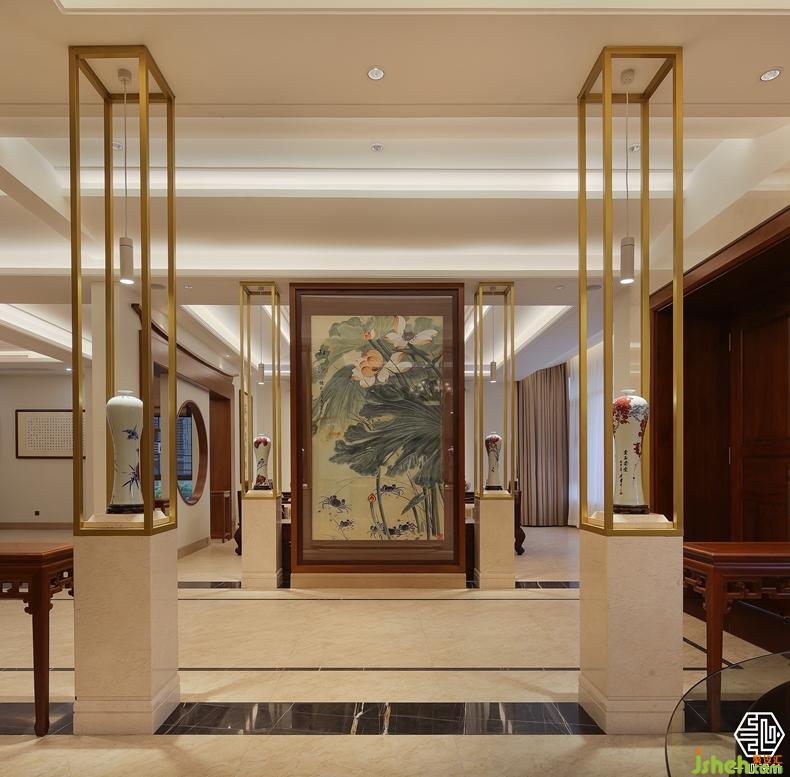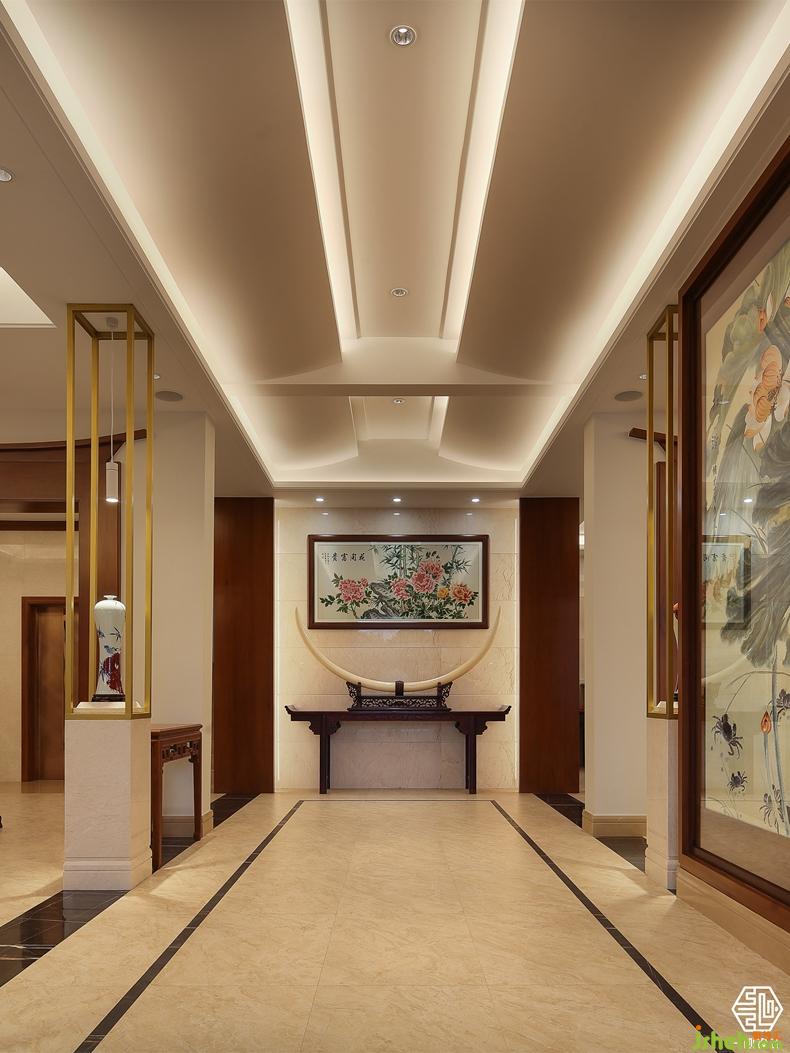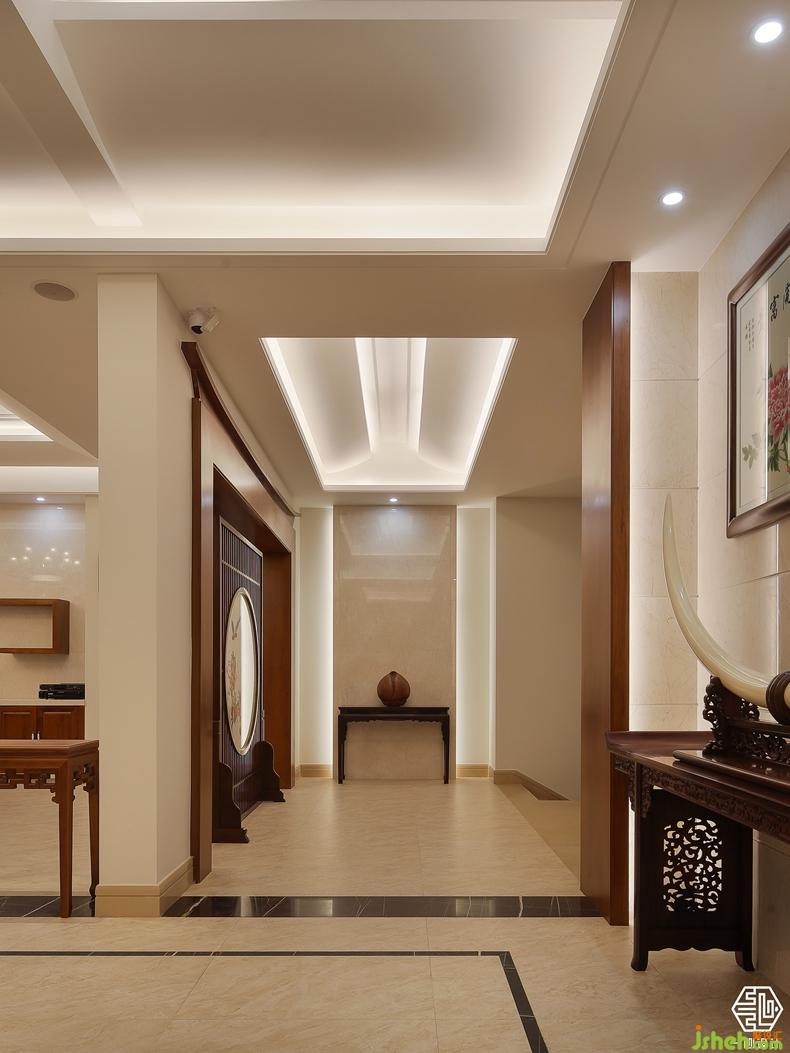 另一戶人家同樣酷愛柚木,更加偏愛簡潔、簡練。別墅裝飾設計師對線條的拿捏輕重有度,著重抓住空間的輪廓,與新中式的設計元素。讓吊頂呈現(xiàn)多種異性的設計,使單一的平直空間有了弧度的開闊性提升,又融入了中式的木元素。既有設計感又賦予空間生命力的延展