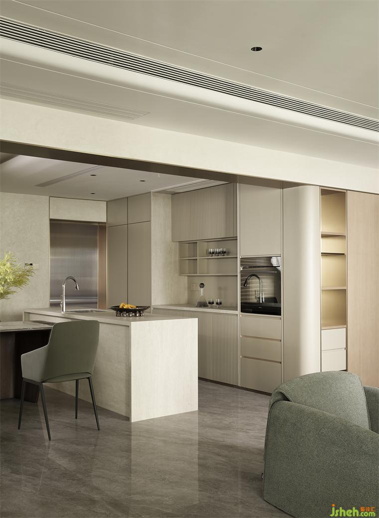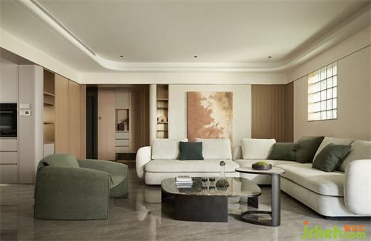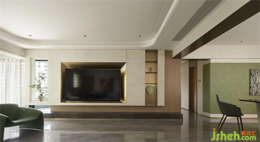 客廳沉穩(wěn)柔和的大地色系,包容著質(zhì)感、材料、光線的互動與變化,住宅設(shè)計營造素雅和簡練的空間氣質(zhì)?;【€感的家具與建筑外窗呼應(yīng)成一體,跳躍的綠色藝術(shù)掛畫與橙色抱枕巧妙地打破了空間的沉悶感。在這個現(xiàn)代主義的時尚空間里,勾勒出溫婉親密的格調(diào)。