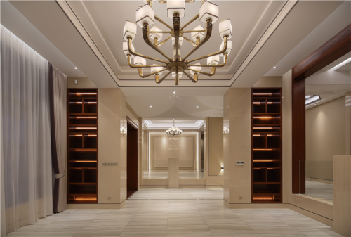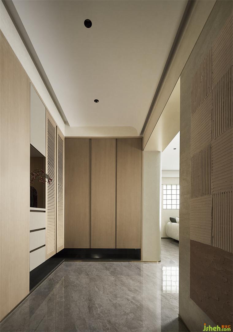 入戶玄關(guān)處,溫潤的原木色構(gòu)成空間最初印象。通頂柜體保證了入戶整體的干凈清爽,搭配懸空設(shè)計拉升視覺感受。