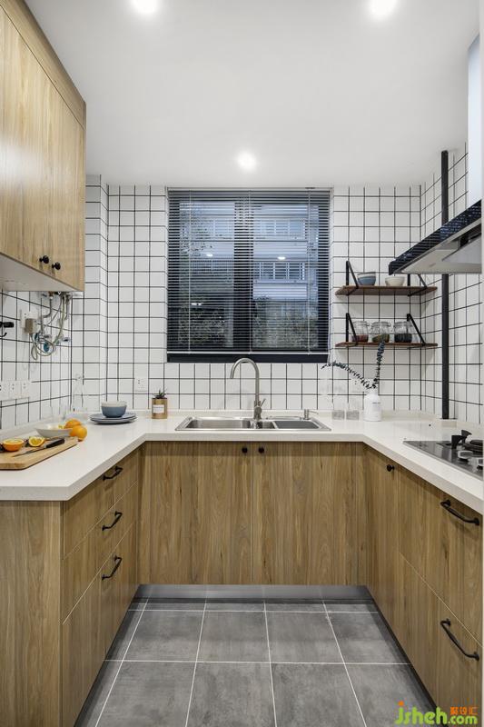 狹小的廚房間選擇流行的白色小面包磚鋪貼墻面與業(yè)主的想法不謀而合,搭配原木的柜體門板,配上裸露的燃?xì)夤艿溃磺卸际悄敲丛甲匀弧?
