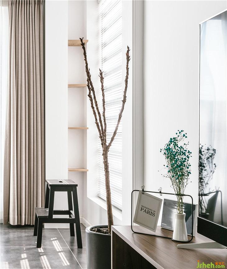 透過(guò)客廳陽(yáng)臺(tái)的窗戶,陽(yáng)光傾灑入室,灰白色木地板完美承接了大自然的過(guò)渡,這是打通陽(yáng)臺(tái)與客廳的好處,增大了采光,也開(kāi)闊了視野。