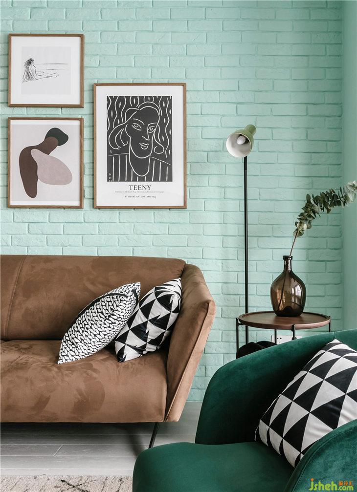客廳沙發(fā)背景墻使用了文化磚,配上清新的薄荷綠,舒適而具有強(qiáng)調(diào)感的家具,在多元素的裝點(diǎn)下,達(dá)到一種平衡狀態(tài),和諧且有趣。