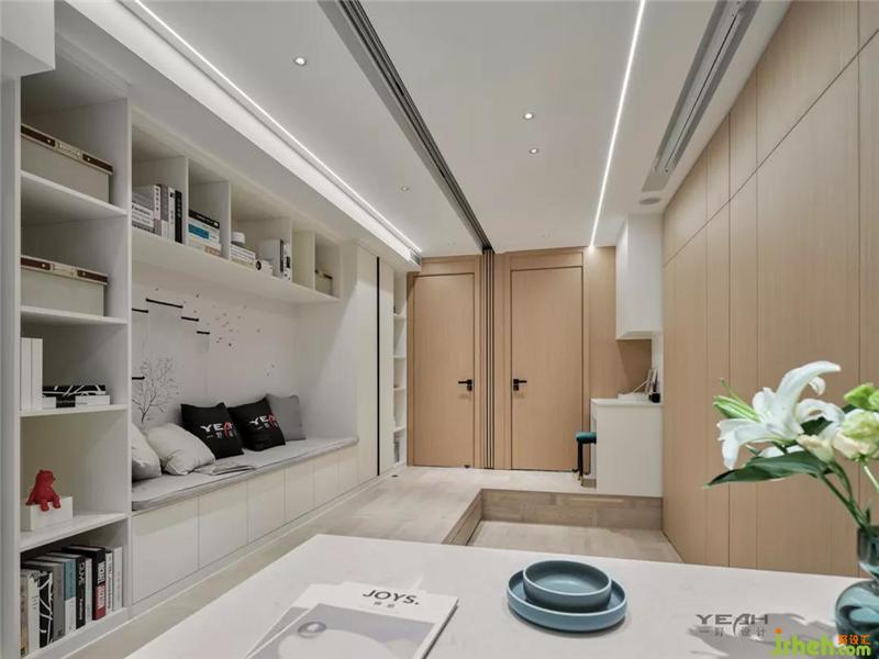 地面的抬高,移動的門板,整塊的護墻的移動數(shù)十秒就可以把客廳變?yōu)榕P室,簡單、便捷,室內(nèi)設(shè)計師真正實現(xiàn)了空間的轉(zhuǎn)換。