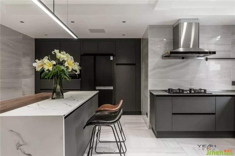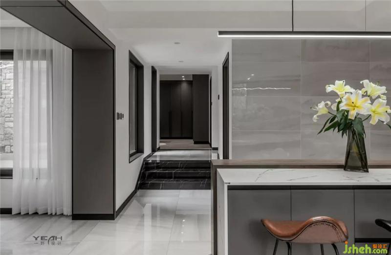 In order to make the living room more spacious, the designer arranged all the guest dining room on the first floor according to the rules, but arranged the dining room and kitchen cloakroom on the negative first floor. This made the housework more clear and concise, and the hostess was dealing with it. Become more efficient in housework.